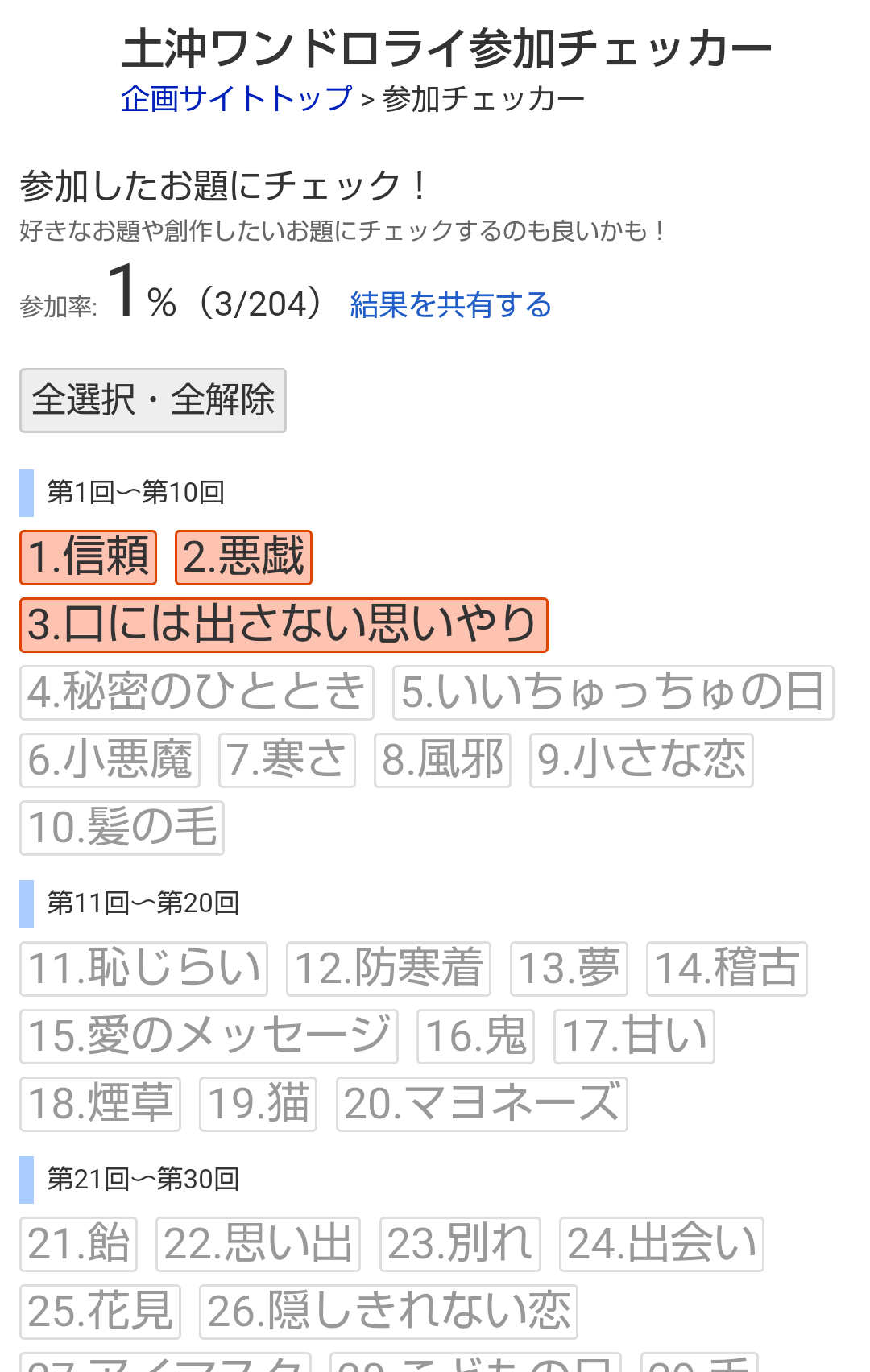 参加したお題にチェックを入れて消化済みお題と参加率を可視化し、SNSで結果を共有できるWebアプリです。